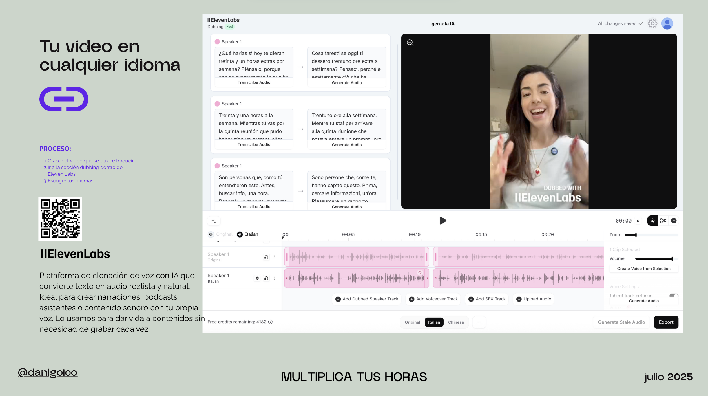 Durante dos horas, Daniela comparte su metodología y los procesos que ella y su equipo han implementado para multiplicar las horas del día con IA, combinando herramientas, mentalidad estratégica y ejemplos reales de la empresa participante.